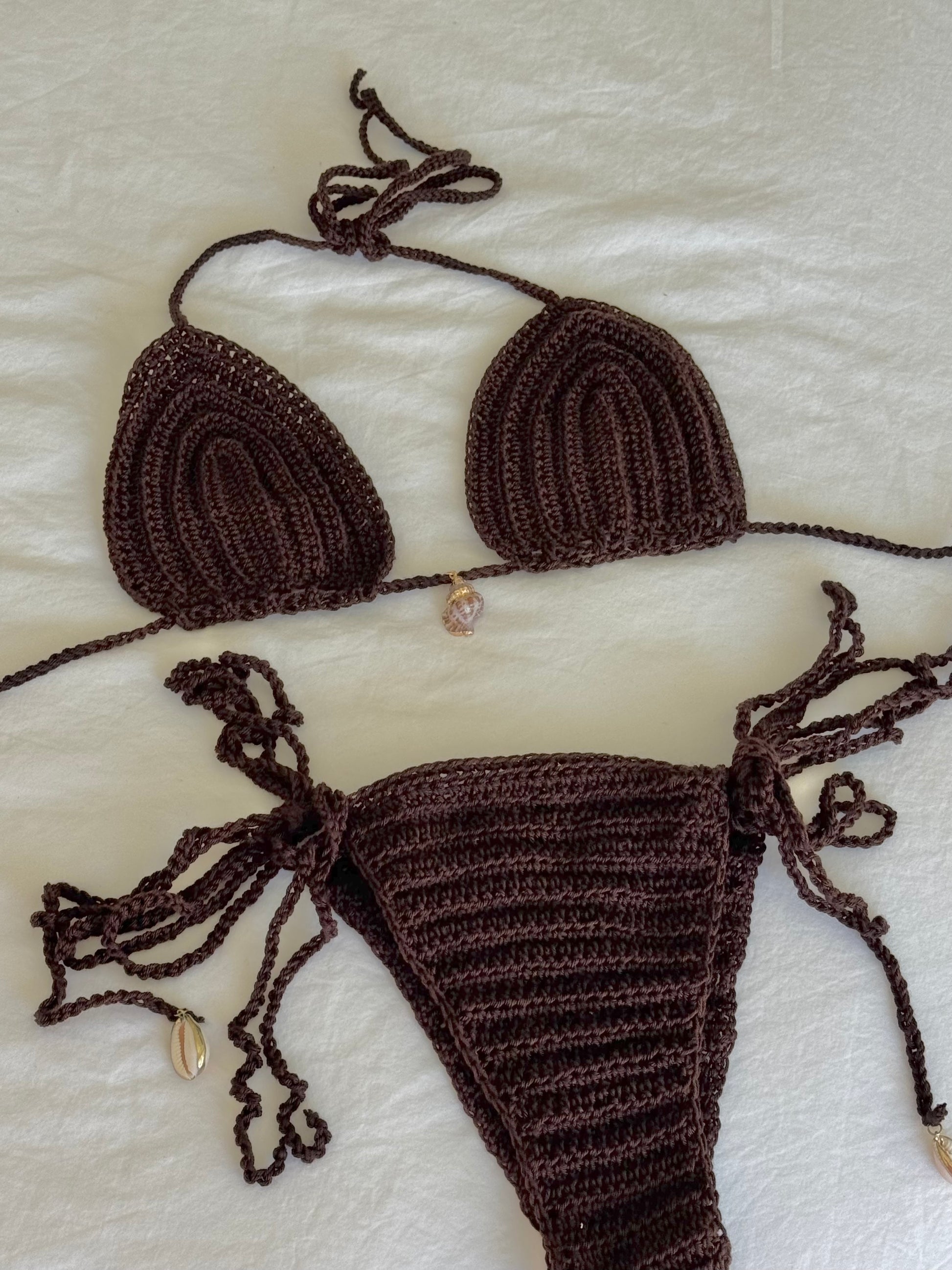 Earthy, sleek, and timeless, this brown crochet bikini bottom is handcrafted with soft, durable microfiber acrylic yarn for a smooth, lightweight feel. Designed with adjustable side tie straps with shell details, it offers a customizable, flattering fit that moves with you. The rich, neutral tone adds a touch of natural elegance, while the cheeky cut keeps the look laid-back and confident. Perfect for effortless beach days, poolside lounging, or your next tropical escape.